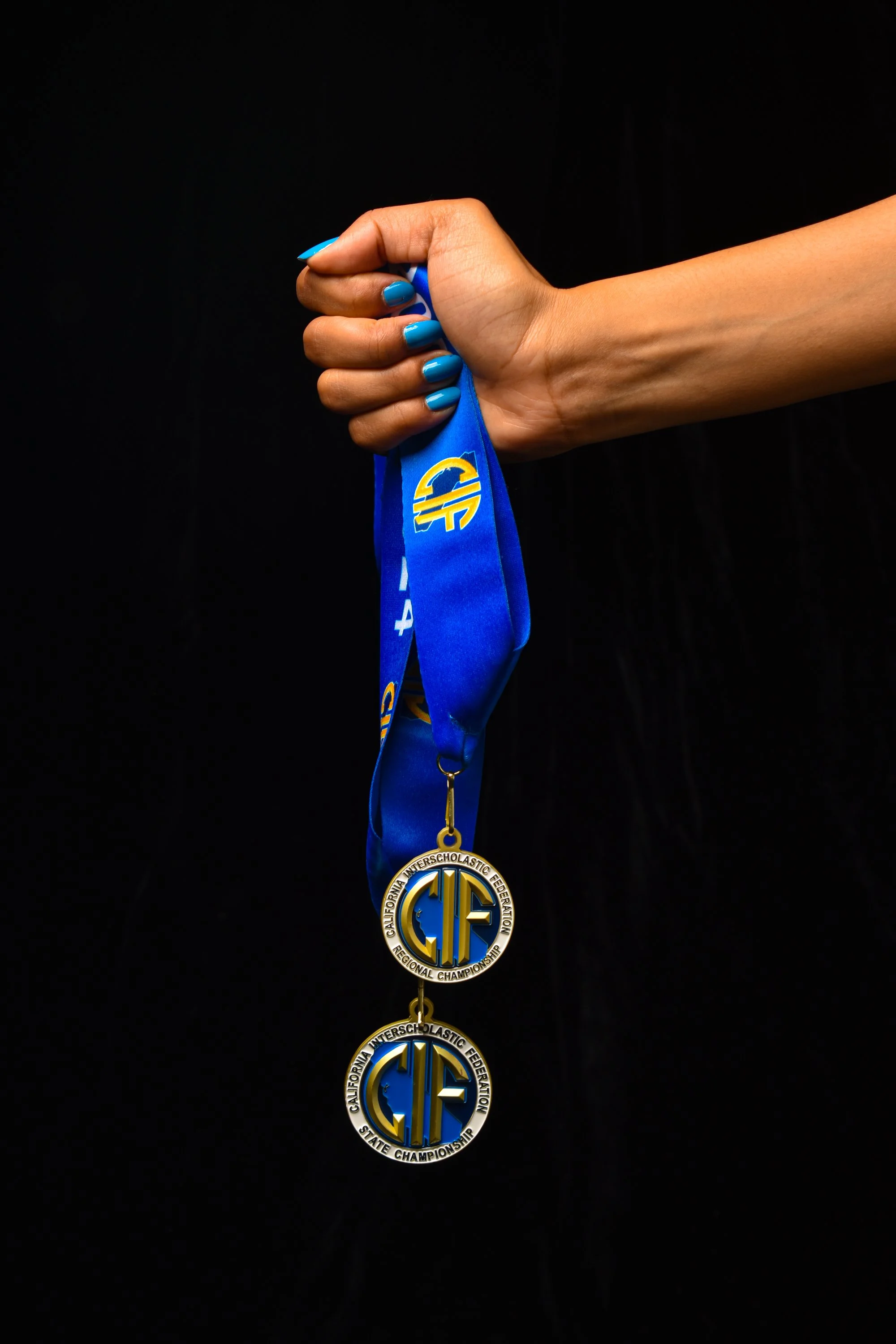 I really like a lot of my photos, but one of my favorites is the 9th image in my series, the one where I'm holding the medals. Those medals are my regional and state championship medals which I won my freshman year. I like the image because of the way the blue medals and my blue nails stand out against the black background and how tightly my hand is clutching them. This image speaks to the way I try to live up to their legacy (since they also won state championships in high school) and how proud I am when I get even a part of it.