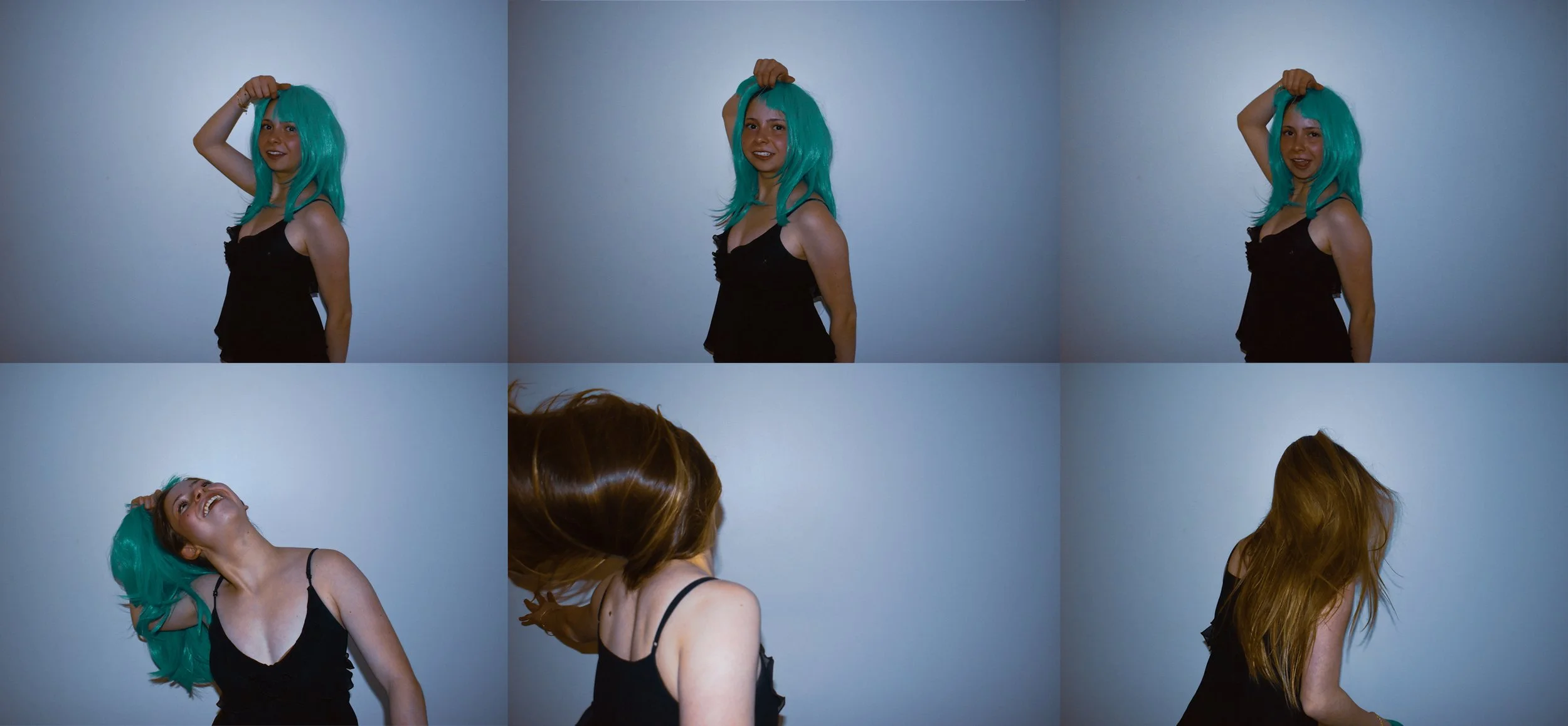 The grid photo is my favorite image because it represents the key frames of my friend taking her wig off. It was apart of a larger joke about a guy, but to take this moment and transform it into a grid makes me happy because it tells a whimsical story, showcasing the fun that we have when we're able to express ourselves freely.